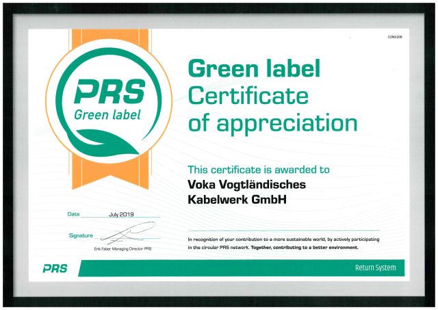 VOKA erhält PRS Green label Certificate of appreciation